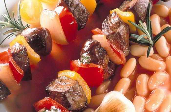 Réincorporer les haricots dans l’assiette et l’accompagner des brochettes servies à part bien chaudes.