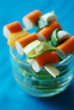 Assembler 12 brochettes en alternant 1 tronçon de surimi, 1 rondelle de citron vert repliée en 4, 1 dé de pomme verte, 1 tronçon de surimi, 1 dé mangue et terminer par un tronçon de surimi.
