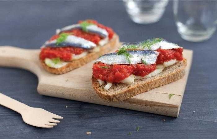 Sur chaque tranche de pain, étalez une bonne couche de pesto, puis recouvrez d’un morceau de poivron rouge et posez la sardine (coupée en deux ou non, c’est en fonction de la grosseur de vos tranche de pain). Poivrez (le sel n’est pas nécessaire : le pesto et les sardines sont déjà salés).