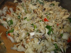 4- Dans une jatte, préparez une sauce avec le vinaigre, l'ail et le piment. Ajoutez les morceaux de morue et laissez-les s'imbiber quelques temps.