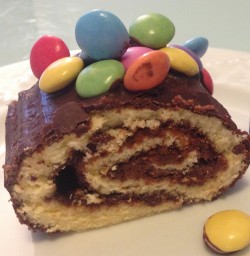 Sortez le roulé, déroulez-le et tartinez de Nutella !Eparpillez les confiseries et roulez le gâteau sur lui-même.