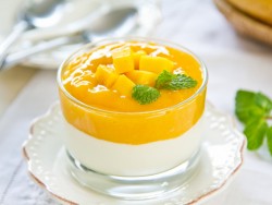 Recette de : Glace à la vanille sur lit de grenade nappé à la mangue.