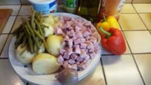 8) Ajoutez dans cette vinaigrette, les haricots, les pommes de terre, le maïs, le poivron, le jambon et le cervelas. Remuez et mettez à réfrigérer. Servez très frais.