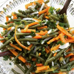 - 1 carotte- 1 navet- 1 pomme- 1 poignée d'haricots vert- 4 cuillères à soupe de maïs- 1 citron- 2 cuillères à soupe de vinaigre de xérès- fleur de selPréparation de la recette Salade croquante au vinaigre de xérès