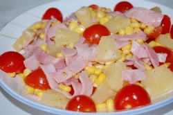 - 1 petite boîte d'ananas coupé en dés ou ananas frais- 1 boîte de maïs- 1 paquet de dés de jambon- quelques dés de gruyère- mayonnaise (au minimum 3 à 4 cuillères à soupe)- 1 à 2 cuillères à soupe de curry (selon le goût)Préparation de la recette Salade d’ananas au maïs