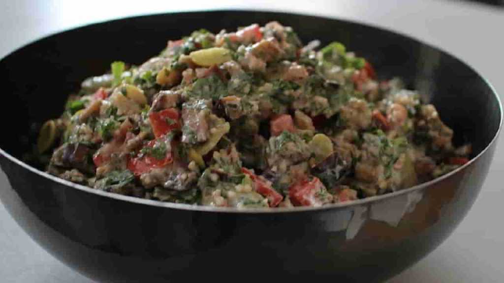 Recouvrir d’une feuille d’aluminium et poursuivre la cuisson à four chaud (th6-180°C) pendant 30 min; laisser refroidir. Mélanger courgettes et aubergines au couscous et mettre au frigo.