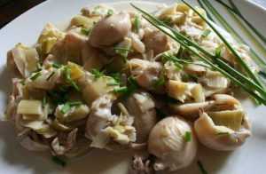 Mettre dans une cocotte avec le verre de vin blanc et 1 verre 1/2 d’eau + un peu de gros sel.