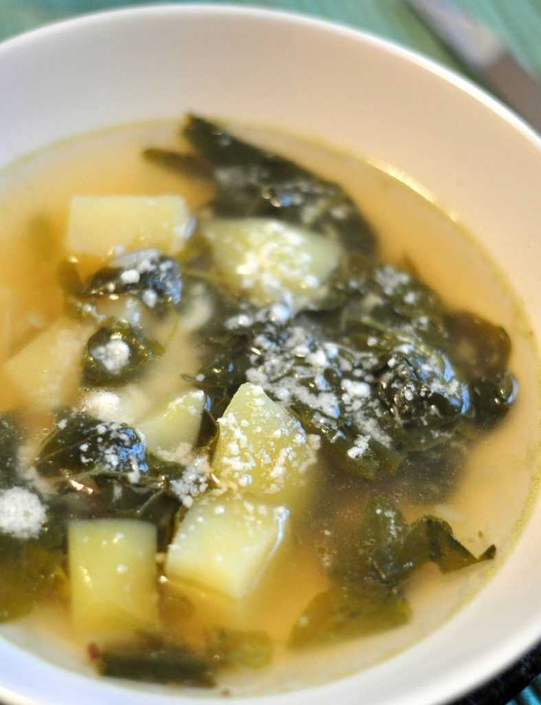 Dans un faitout ou un autocuiseur, mettre 1,5 l d’eau, y plonger les broutes ébouillantées, les pommes de terre, l’ail, le morceau de confit ou de jambon.Saler et poivrer.
