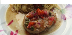 - 2 tranches de thon de 400 g pièce- 2 gros oignons coupés en rondelles- 1 gousse d'ail- 2 cuillères à soupes de farine- 1 verre de vin blanc sec- huile d'olive- sel et poivre- 750 g de tagliatelles fraîches- 3 à 4 bonnes cuillères a café de pesto- parmesanPréparation de la recette Thon au vin blanc et tagliatelles au pesto